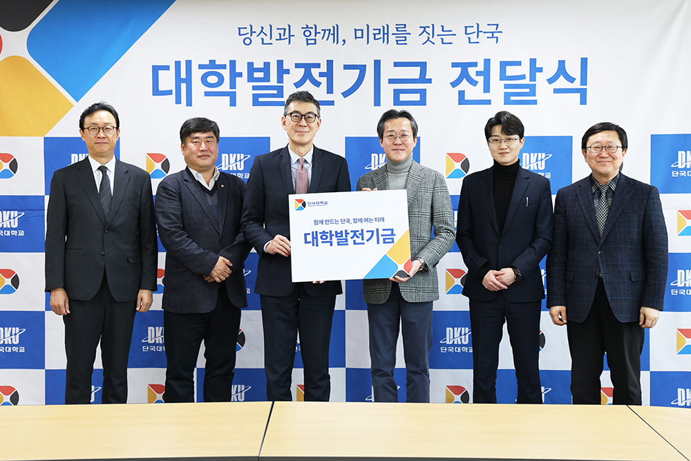 지난 14일(수) 죽전캠퍼스 범정관에서 불교학생회 동문회와 경제학과장학회의 대학발전기금 전달식이 연이어 개최됐다. 이번 전달식은 동문들의 지속적인 나눔을 통해 대학 발전과 후배 양성을 응원하는 뜻을 함께 나누는 자리로 마련됐다. △ 불교학생회 동문회 발전기금 전달식 단체사진(왼쪽부터 김재일 대외부총장, 우상진 운영위원, 신은종 대외협력처장)